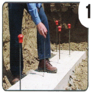 Concrete footing/slab must be straight and flat. Install a short length of vertical rebar and place alignment collars. Snap a chalk line for position of forms. Allow 4" for total form thickness plus bracing on 1 side.